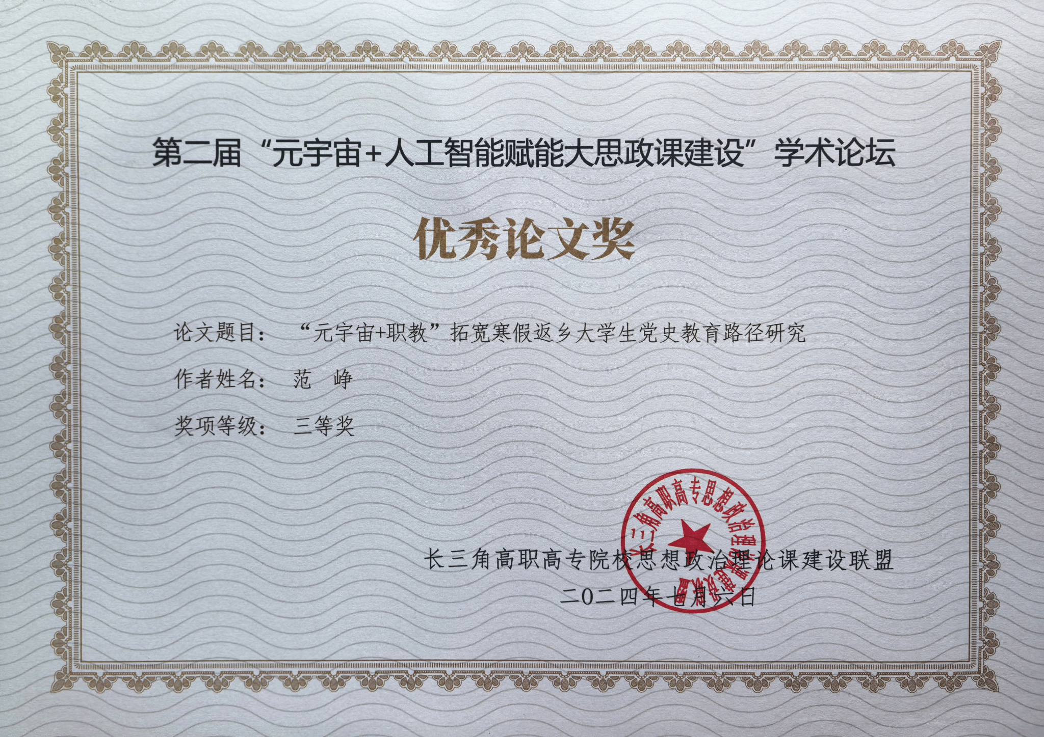 广西建院7月9日讯( 马克思主义学院 莫玉婵)近日,第二届“元宇宙+人工智能赋能大思政课建设”学术论坛优秀征文活动评选结果揭晓。我校马克思主义学院思政课教师在评选活动中荣获特等奖1项、一等奖1项和三等奖1项。其中,李生、毕莉撰写的《虚拟仿真技术赋能高校思政课党史教学的价值、着力点及风险应对》荣获特等奖;莫玉婵撰写的《新时代信息技术与高校思政课教学融合的现实审思与实现路径》荣获一等奖;范峥撰写的《“元宇宙+职教”拓宽寒假返乡大学生党史教育路径研究》荣获三等奖。