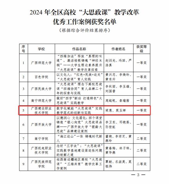 广西建院9月6日讯(马克思主义学院 宋佳雄)近日,自治区教育厅公布了2024年全区高校“大思政课”教学改革优秀工作案例和示范课堂征集活动获奖名单。开云线上平台_开云(中国)马克思主义学院教师梁惠、莫玉婵的作品《数字化赋能“大思政课”实践教学范式的创新与实践》荣获“优秀工作案例”一等奖,毛娟翠、张博闻、毕莉的作品《传承八桂乡情,构筑中华民族共有精神家园》荣获高职高专组“示范课堂”二等奖,黄哲、梁晓祺、梁惠的作品《中国式现代化视域下壮美广西的甜蜜事业》及江紫凤、谭臻、刘荔源的作品《“三坚持”走好群众路线 各民族共铸“石榴情深”》分别荣获高职高专组“示范课堂”三等奖。