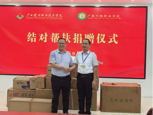座谈会后,付春松处长代表学校,向广西工程职业学院捐赠了一批教学工具。付春松处长表示,此次捐赠,旨在进一步丰富工程职院的教学资源,推动教学质量的提升。黄德伟副校长代表学校对此次捐赠表示最诚挚的感谢。