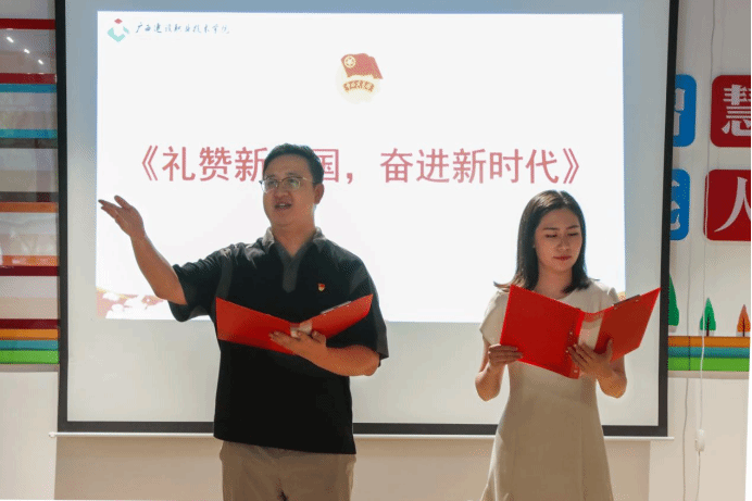 学生社区功能型团总支书记代表孙文、毛森森老师表演诗朗诵《礼赞新中国,奋进新时代》