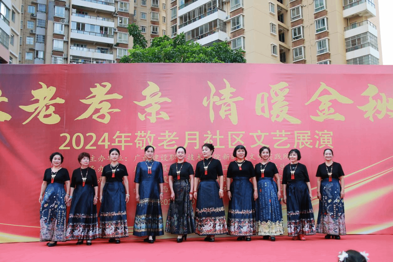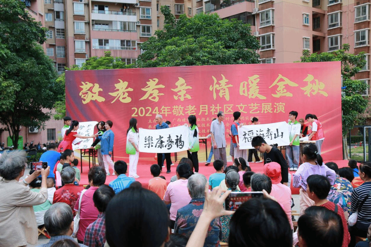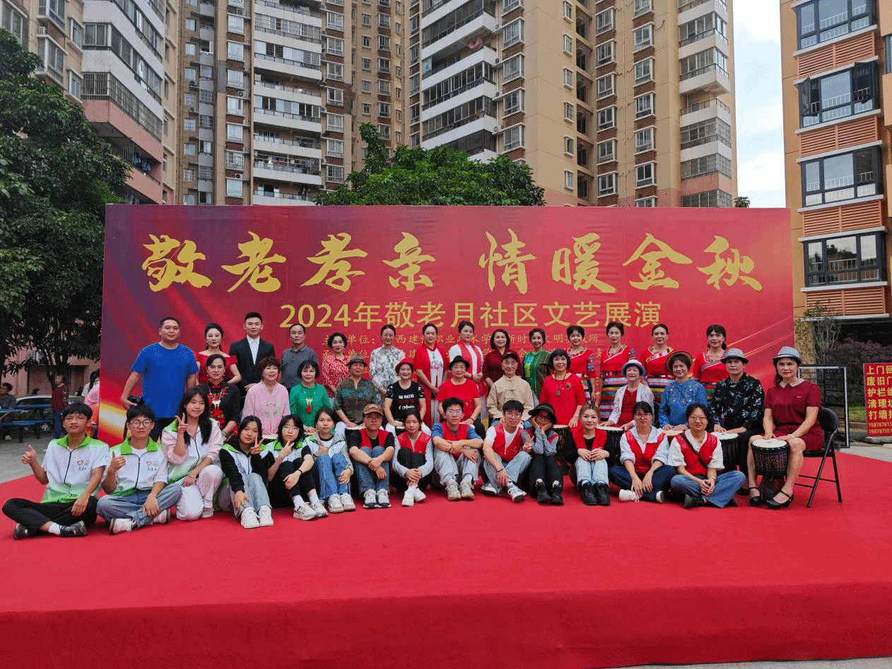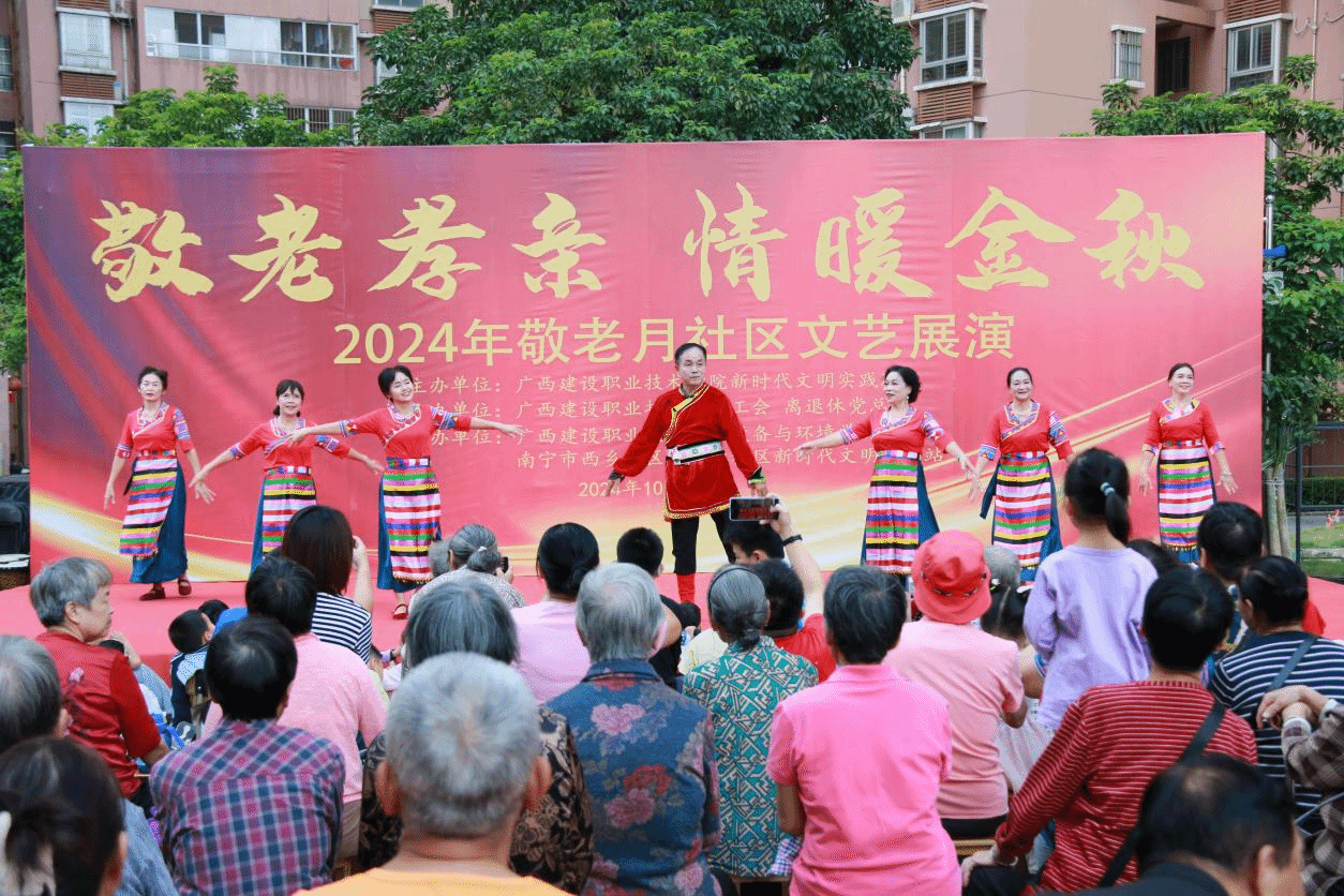 广西建院10月29日讯(工会 黄军萍)2024年10月是我国第15个敬老月。为弘扬中华民族尊老敬老的传统美德,营造养老孝老敬老的社会氛围,学校新时代文明实践所、学校工会、离退休党总支携手秀灵北社区居委会、开云线上平台_开云(中国)与规划学院、设备与环境学院、农行南宁科技支行、爱尔眼科医院,于10月26日在建苑小区举办“敬老孝亲 情暖金秋”敬老月文艺展演。