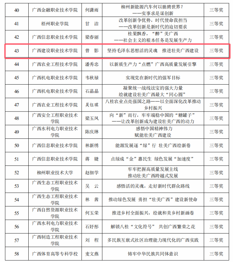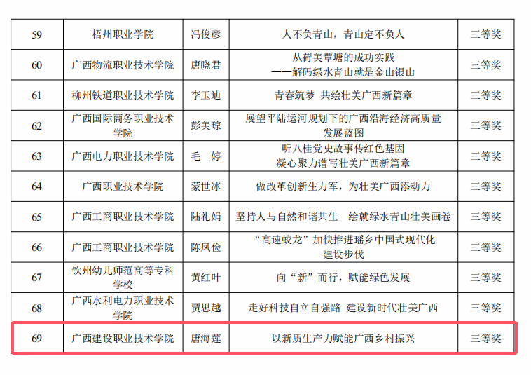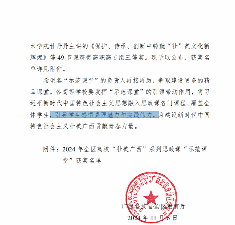 广西建院11月13日讯(马克思主义学院 宋佳雄)近日,自治区教育厅公布了2024年全区高校“壮美广西”系列思政课“示范课堂”获奖名单。开云线上平台_开云(中国)马克思主义学院思政课教师梁晓祺参评的作品《改革创新赋动能 “桥”见壮美广西新篇章》荣获高职高专组一等奖,黄云清老师参评的作品《以新发展理念引领高质量发展—一根甘蔗的甜蜜新生》荣获高职高专组二等奖,曾影、唐海莲老师参评的作品《坚持毛泽东思想活的灵魂 推进壮美广西建设》《以新质生产力赋能广西乡村振兴》分别荣获高职高专组三等奖。