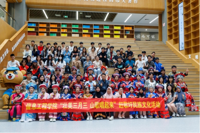 广西建院4月9日讯(信息工程学院文/罗凤媚 罗雪连图/甘海龙)为弘扬民族传统文化,展现民族文化魅力,4月9日下午,信息工程学院在学校图书馆大厅组织开展了“壮美三月三 山歌唱起来”赶歌圩民族文化活动。学校纪委书记唐东升,信息工程学院领导老师、国际留学生及学生代表参加了本次活动。