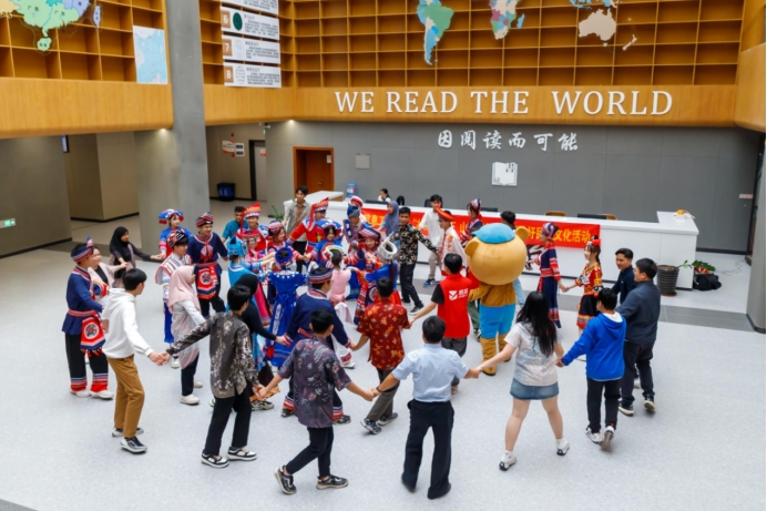 学生们身穿民族服饰到校园各处打卡