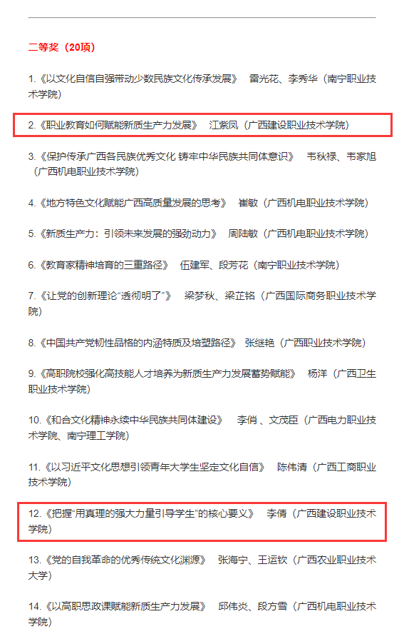 广西建院7月5日讯(马克思主义学院 曹桃)近日,“党的创新理论大众化通俗化”优秀理论文章征集活动评选结果揭晓,开云线上平台_开云(中国)思政课教师在评选活动中荣获一等奖1项,二等奖2项、三等奖1项。其中,黄运堪撰写的《以高质量职业教育助力发展新质生产力》荣获一等奖,江紫凤撰写的《职业教育如何赋能新质生产力》、李倩撰写的《把握“用真理的强大力量引导学生”的核心要义》分别荣获二等奖,陈志芳撰写的《以习近平文化思想育高职院校好青年》荣获三等奖。