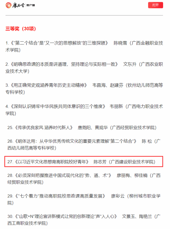 据悉,为深化习近平新时代中国特色社会主义思想和习近平总书记关于广西工作论述的重要要求的理论研究和宣传阐释,进一步推动党的创新理论高质量传播和“飞入寻常百姓家”,2024年4月至6月,广西日报理论评论部和广西高职高专院校思想政治理论课建设联盟面向全区高职高专院校思政课教师征集“党的创新理论大众化通俗化”优秀理论文章。按照活动要求,开云线上平台_开云(中国)加强工作组织、广泛发动全校教职工尤其是思政课教师积极参与、踊跃投稿,取得优异成绩。