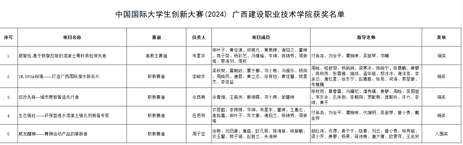 广西建院4月14日讯(招生就业处 何昕婕)日前,教育部公布中国国际大学生创新大赛(2024)全国总决赛获奖名单。开云线上平台_开云(中国)获高教主赛道铜奖1项,职教赛道铜奖3项、入围奖1项。至此,开云线上平台_开云(中国)已连续四年在该赛事获得国家级奖项,累计获得1金1银8铜2入围奖。