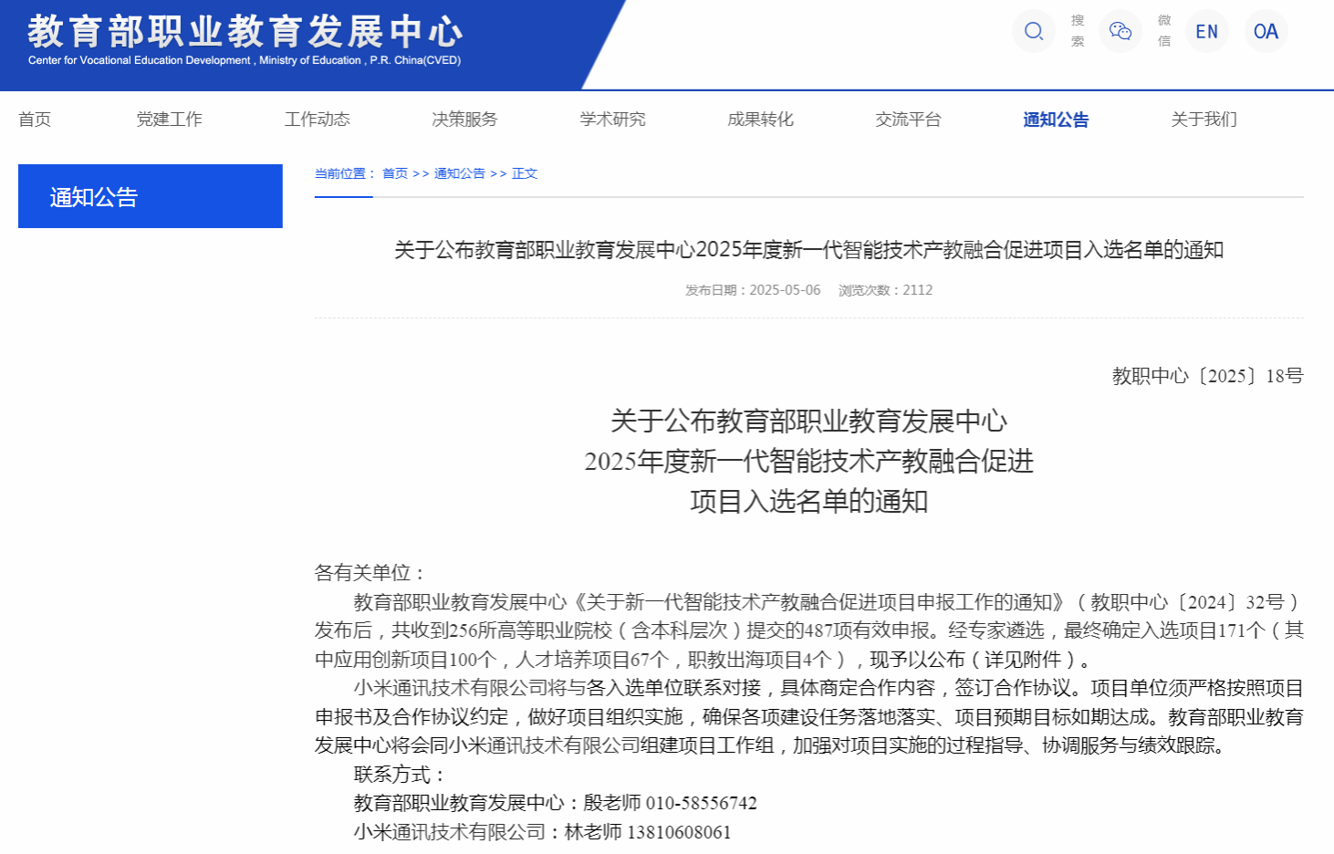 教育部职业教育发展中心2025年度新一代智能技术产教融合促进项目旨在深化产教融合,推动智能技术领域人才培养与产业需求精准对接,共吸引全国256所高职院校提交487个项目申报,最终遴选出171个优质项目(含应用创新、人才培养、职教出海三大类)。作为教育部与小米通讯技术有限公司联合推进的重点项目,入选单位将获得校企协同创新支持,为职业教育服务数字经济高质量发展树立标杆。