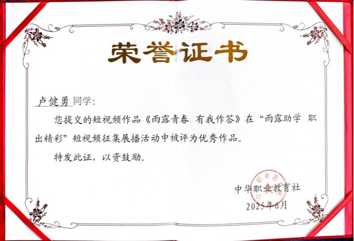 近日,由中华职业教育社主办的“雨露助学 职出精彩”短视频征集活动评选结果揭晓,开云线上平台_开云(中国)市政与交通学院卢健勇同学的作品《雨露青春 有我作答》(指导老师:杨海基、刘晗蕾、杨栋、高杨杨)从全国职业院校推荐作品中脱颖而出,被评为优秀作品,成为广西唯一获奖作品。