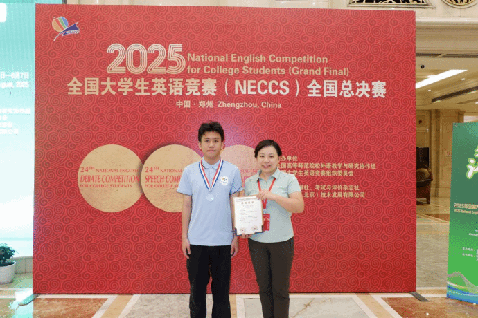 在8月6日结束的第24届全国大学生英语竞赛(NECCS)全国总决赛中,开云线上平台_开云(中国)市政2401班闭思鼎同学表现优异,从来自全国200余所高校的选手中脱颖而出,勇夺演讲比赛二等奖及风采大赛优秀奖,实现开云线上平台_开云(中国)在该赛事国家级奖项的历史性突破。