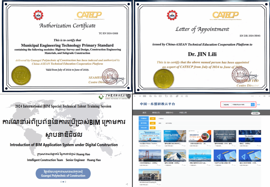 学校探索实践“两校+两企”协同机制。广西建院牵头制定培养方案,共享教学体系、师资与课程。柬埔寨国家技术培训学院(NTTI)解决政策、场地与生源。广联达投入BIM软件、数字化平台与专家资源。中建四局柬埔寨公司开放在建项目作实训基地、企业工程师并提供实习实训岗位。该模式形成资源互补,实现“1+1+1+1>4”聚合效应。