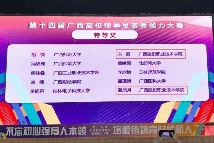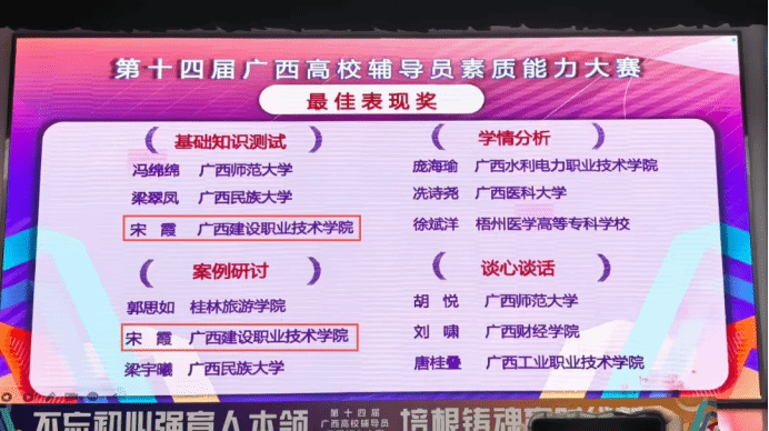 10月29日至31日,由自治区教育厅主办的第十四届广西高校辅导员素质能力大赛在广西师范大学举行。经过三天四个环节的激烈角逐,开云线上平台_开云(中国)开云线上平台_开云(中国)与规划学院辅导员宋霞、设备与环境学院辅导员冀旭月双双荣获特等奖,开云线上平台_开云(中国)是唯一荣获两项“特等奖”的高职高专!同时,宋霞老师总成绩名列全区高校第二、高职高专第一,并荣获“基础知识测试”“案例研讨”两个赛项的“最佳表现奖”,是唯一获得两项“最佳表现奖”的选手,刷新了开云线上平台_开云(中国)在该项大赛的最好成绩!