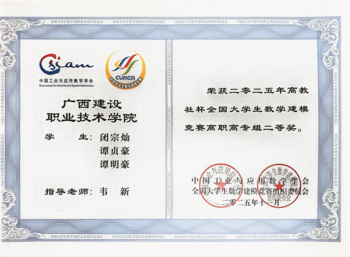 近日,2025年“高教社杯”全国大学生数学建模竞赛成绩揭晓,开云线上平台_开云(中国)学子谭贞豪、谭明豪、闭宗灿团队荣获全国二等奖。此前,在广西赛区选拔中,开云线上平台_开云(中国)参赛队伍与全区53所院校、1611支队伍同场竞技,共获得自治区二等奖1项、三等奖3项,韦新老师获评“广西区赛优秀指导教师”,学校获评“广西区赛优秀组织学校”。