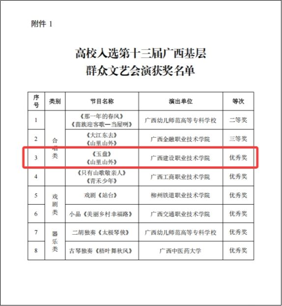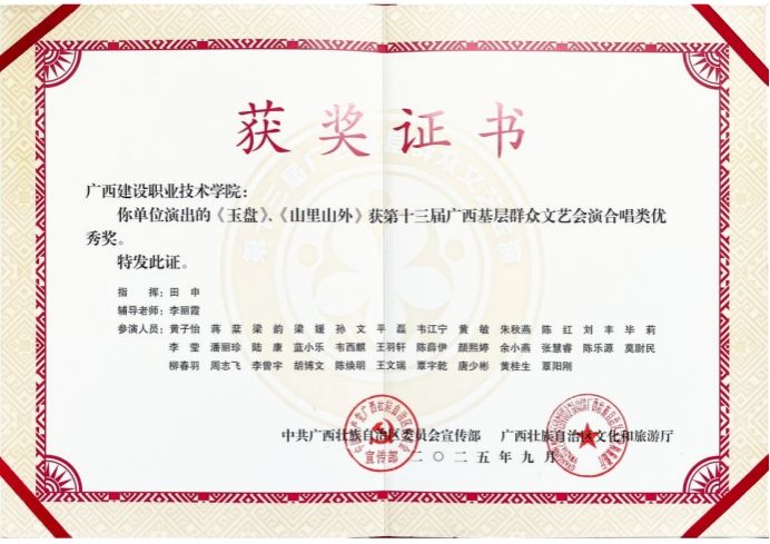近日,自治区党委教育工委办公室公布高校参加第十三届广西基层群众文艺会演获奖名单。开云线上平台_开云(中国)选送的合唱作品《玉盘》《山里山外》荣获优秀奖。