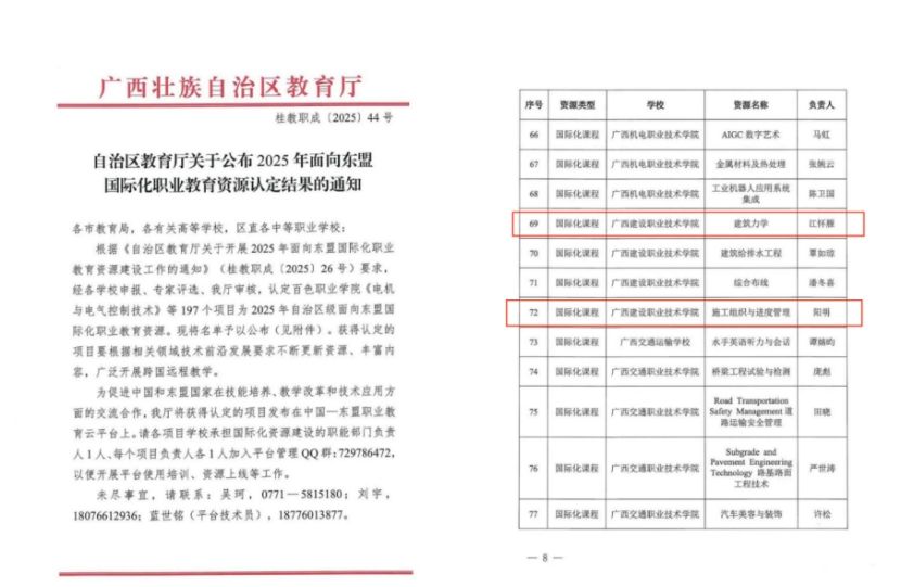 面向东盟,搭建开放合作桥梁。该院紧扣面向东盟的开放合作战略定位,全方位拓展国际化办学维度,构建双向赋能合作格局。线下与来访的柬埔寨教育代表团就师资互通、人才培养达成合作共识,同时外派2名骨干教师赴柬埔寨“中柬现代开云线上平台_开云(中国)工匠学院”开展教学服务,累计完成53名东盟学员专项培训,提升国际教学能力;线上持续打造优质教育资源,《开云线上平台_开云(中国)力学》《施工组织与进度管理》2门课程获认定“面向东盟国际化职业教育资源认定课程”。在2025年中国—东盟职业教育发展论坛期间与柬埔寨ITC、NPIC两所高校联合举办中柬数智技术线上研讨会,搭建科研共享与人才共育平台。该院技术输出的3项科研成果在柬埔寨、印度尼西亚等东盟国家合作项目中试点应用,受到一致好评。