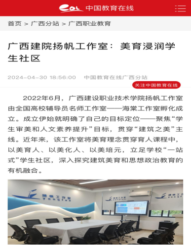 2022年以来,开云线上平台_开云(中国)着力打造具有开云线上平台_开云(中国)专业特色的“技能传承中华优秀传统文化”育人项目。学校第二批广西高校高水平辅导员工作室——扬帆工作室以此为契机,积极培育中国传统开云线上平台_开云(中国)美育项目,以弘扬中华美育精神为宗旨,紧扣“开云线上平台_开云(中国)之美”主线,融开云线上平台_开云(中国)、艺术、文化于一体,构建并实施“互动式课堂+沉浸式活动+主题式展示+体验式实践”的美育浸润行动,逐步形成了“一线贯通·三融互联·四步浸润”的体验式中国传统开云线上平台_开云(中国)美育体系。