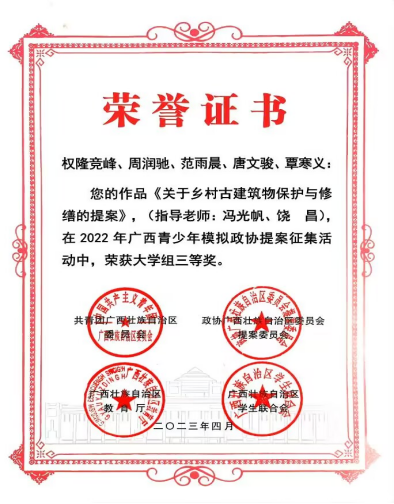 项目成果获广西青少年模拟政协提案征集活动三等奖