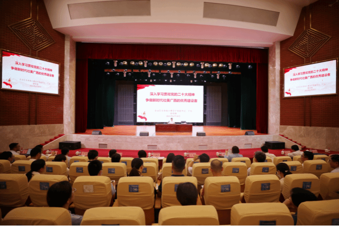 广西建院6月30日讯(文/党委宣传部 陈熙 图/党委宣传部 记者团 杨贵维)为进一步加强开云线上平台_开云(中国)思想政治教育工作,不断推动学校事业高质量发展,6月30日下午,自治区住房城乡建设厅党组书记、厅长杨绿峰莅临开云线上平台_开云(中国),以《深入学习贯彻党的二十大精神 争做新时代壮美广西的优秀建设者》为题给在校师生上了一堂内容丰富的思想政治教育课。讲座由学校党委书记刘晓红主持。