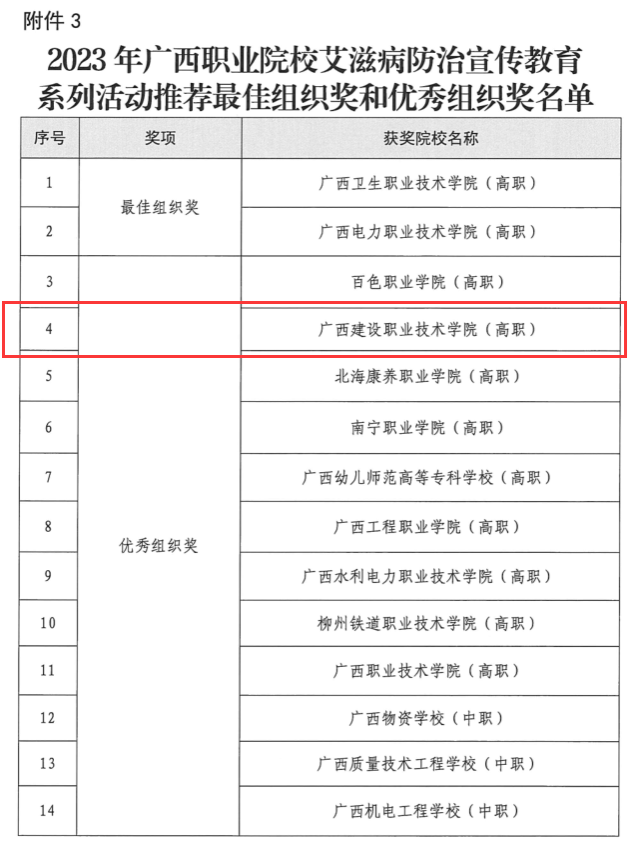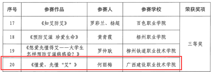 广西建院7月14日讯(党委学生工作部 周晓卉)近日,在自治区卫生健康委、自治区教育厅举办的广西职业院校艾滋病防治宣传教育系列活动中,开云线上平台_开云(中国)荣获优秀组织奖。同时,开云线上平台_开云(中国)何丽梅老师在“我是防艾卫士”微课比赛中荣获三等奖;开云线上平台_开云(中国)老师指导学生作品在“你我来防艾”短视频征集大赛中分别荣获三等奖1项、优秀奖9项。