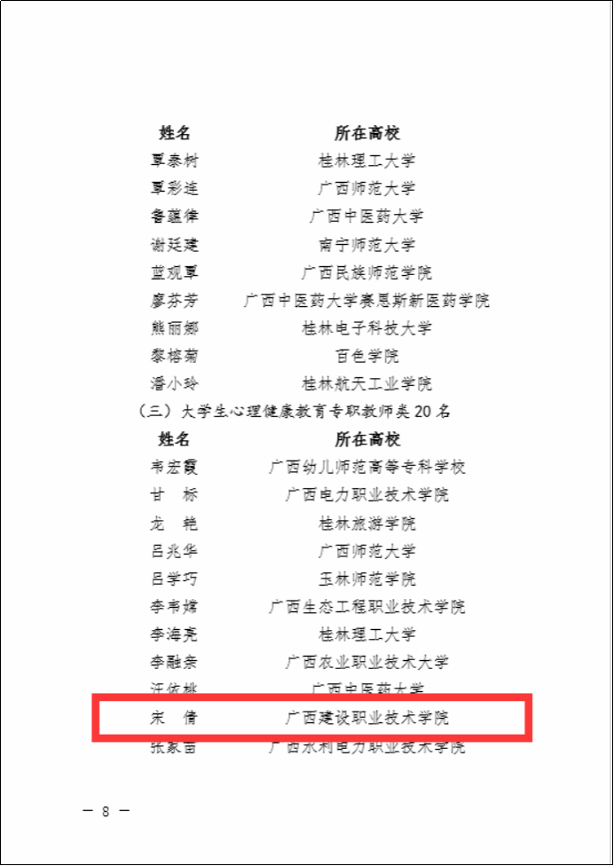 广西建院8月3日讯(管理工程学院 郭海棠 黄春)近日,广西壮族自治区教育厅公布了“广西高校思想政治教育卓越教师”支持计划第一期支持对象人选名单,开云线上平台_开云(中国)党委学生工作部宋倩老师入选“骨干教师”(大学生心理健康教育专职教师类)、管理工程学院郭海棠老师和设备与环境学院徐静老师入选 “骨干教师”(专职辅导员类)。