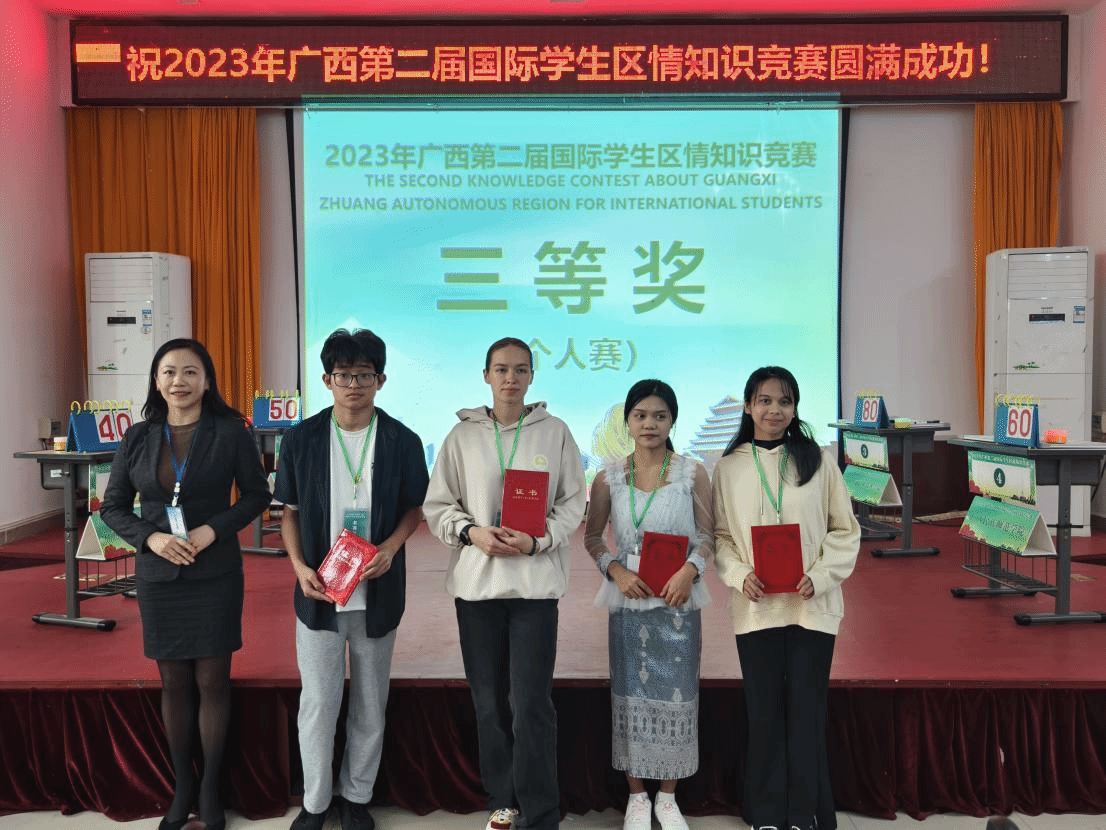 广西建院12月16日讯(文\教务处 李莹 图\国际交流中心 谢泽芸)12月13—15日,2023年广西第二届国际学生区情知识竞赛在柳州城市职业学院举行,来自全区17所本科、高职院校的50名国际学生参加了此次比赛。开云线上平台_开云(中国)获团体赛项三等奖,艺术设计学院陈俊睫同学获得个人赛三等奖、信息工程学院黄赈羱同学获优秀奖。