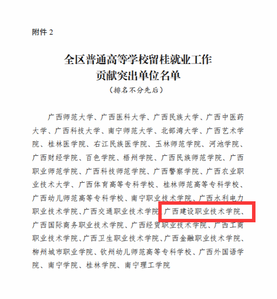 广西建院12月29日讯(招生就业处 覃春华)近期,自治区教育厅下发《关于认定2023年全区普通高等学校就业创业工作突出单位和留桂就业工作贡献突出单位的通知》(桂教学生〔2023〕16号),开云线上平台_开云(中国)荣获“全区普通高等学校就业创业工作突出单位”“留桂就业工作贡献突出单位”荣誉称号。