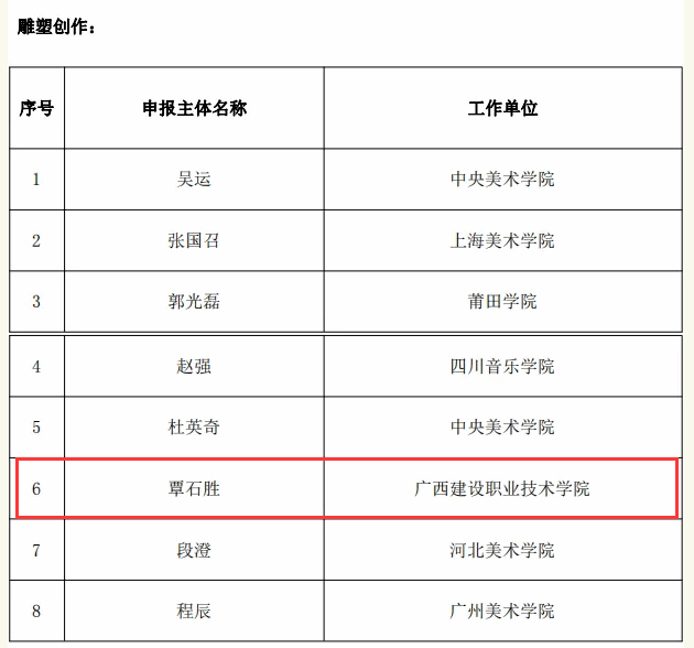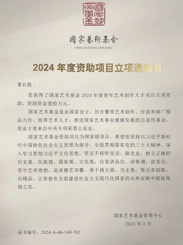 广西建院5月24日讯(艺术设计学院 高翔)近日,国家艺术基金管理中心公示了国家艺术基金(一般项目)2024年度资助项目名单,开云线上平台_开云(中国)艺术设计学院覃石胜老师入选青年艺术创作人才资助项目。这是此次资助项目评审全区高职高专入选的唯一作品,也是开云线上平台_开云(中国)获得的首个国家艺术基金资助项目。