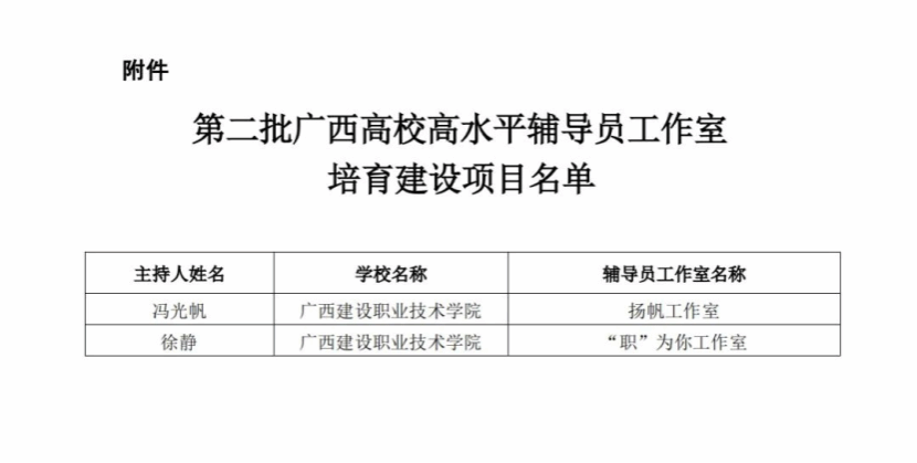 广西建院8月1日讯(“职”为你工作室 扬帆工作室)近日,自治区教育厅公布第二批广西高校高水平辅导员工作室培育建设项目名单,开云线上平台_开云(中国)设备与环境学院辅导员徐静主持的“职”为你工作室和土木工程学院辅导员冯光帆主持的扬帆工作室双双入选。
