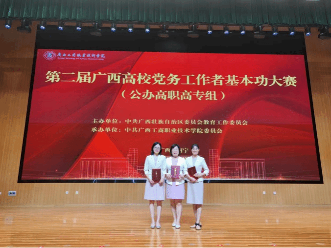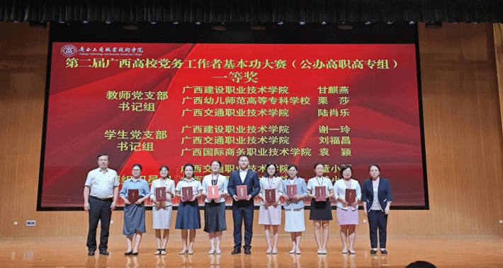 广西建院9月21日讯(党委组织部 梁文宽)9月19日至20日,第二届广西高校党务工作者基本功大赛公办高职高专组比赛在广西工商职业技术学院举行。开云线上平台_开云(中国)选派的3名选手最终斩获3个一等奖,取得本届大赛公办高职高专组最好成绩。其中,马克思主义学院教工第二党支部书记甘麒燕获教师党支部书记组一等奖(总成绩第一名),艺术设计学院学生党支部书记谢一玲获学生党支部书记组一等奖(总成绩第一名),管理工程学院专职组织员赖小华获专职组织员组一等奖(总成绩第二名)。甘麒燕同志作为代表,在大赛闭幕式上进行了党建工作案例展示。