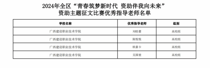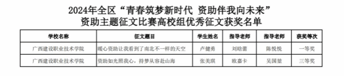 广西建院10月20日讯(文/杨栋)近日,自治区教育厅公布2024年全区“青春筑梦新时代 资助伴我向未来”资助主题征文比赛获奖名单,开云线上平台_开云(中国)选送的两个作品分别荣获一等奖和三等奖,指导老师获评优秀指导老师。