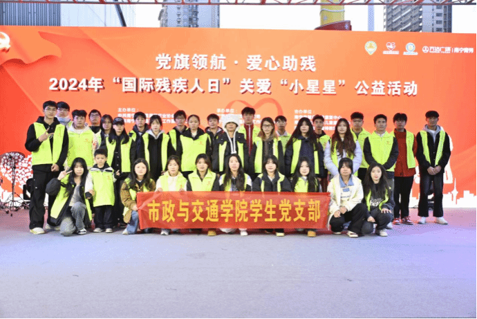 广西建院12月28日讯(市政与交通学院 刘晗蕾)12月28日,市政与交通学院学生党支部组织35名师生参与“党旗领航 爱心助残”2024年“国际残疾人日”关爱“小星星”公益活动。本次活动由南宁市小星星社会工作服务中心、南宁市儿童康复行业协会党支部等单位主办,社会各界爱心人士、志愿者以及200个特殊儿童家庭齐聚一堂。活动通过爱心捐赠、文艺表演、放飞梦想气球等形式,让“星星”的孩子们度过了一个开心欢乐的夜晚。
