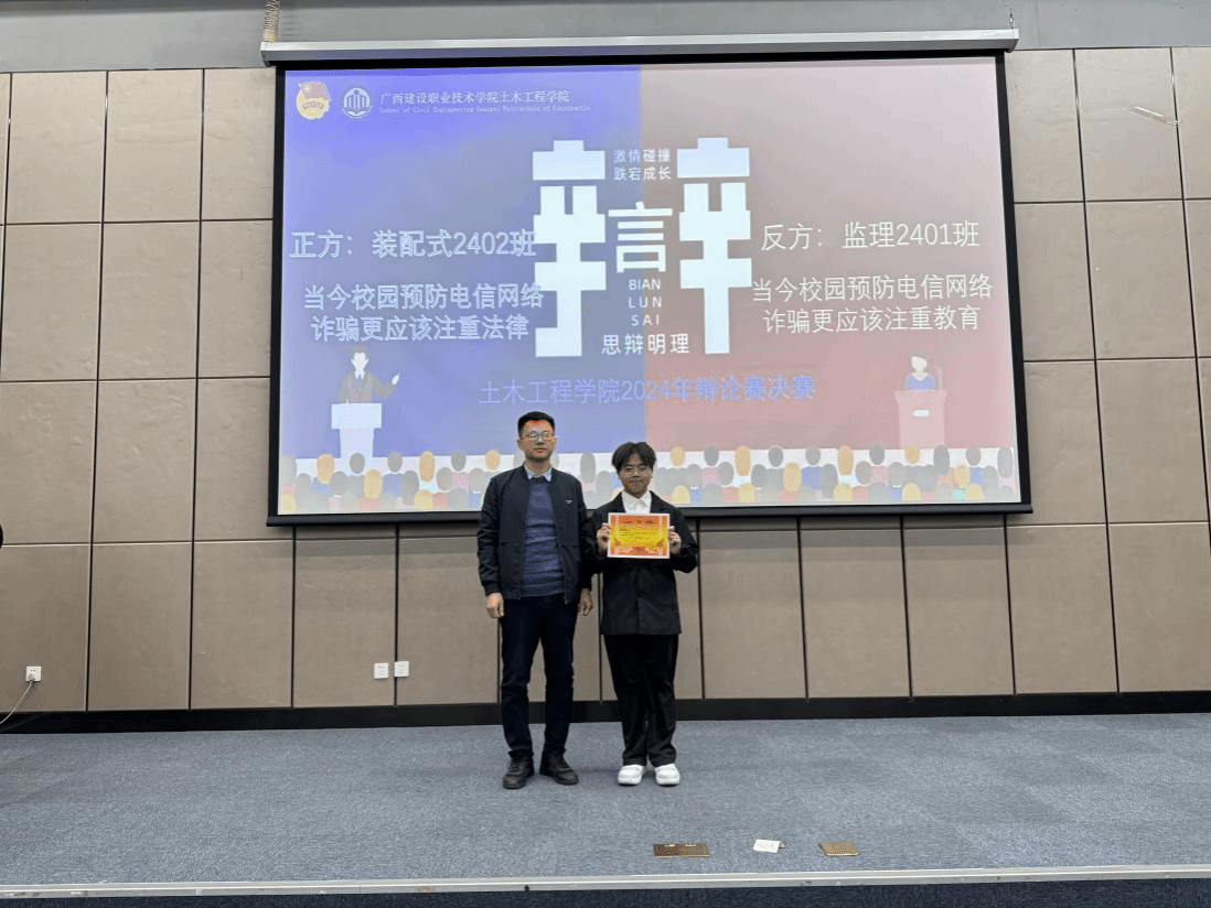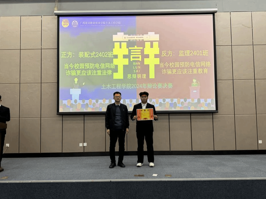 广西建院12月31日讯(土木工程学院 文/石明成 谭妍 图/吴海平 梁建新 张春毅)12月30日,土木工程学院在6教3楼会议室举行2024年辩论赛决赛。此次活动聚焦“提升电信网络诈骗防范意识”主题,深入探讨法律与教育在预防校园诈骗中的核心作用。学院团总支书记冯光帆,辅导员代表,学生代表共158人参加活动。