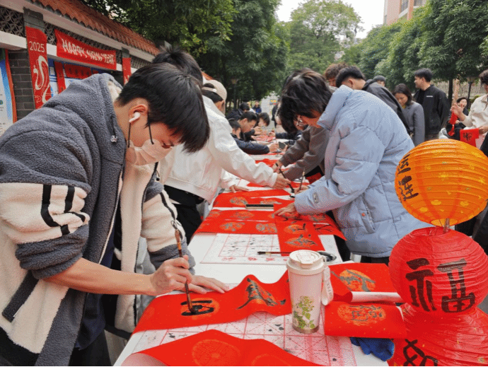 活动现场热闹非凡,300余名同学积极参与其中。有的同学拿起毛笔,挥毫泼墨,书写着对新年的美好祝愿。对于不会写毛笔字的同学,工作室专门邀请了经验丰富的老师和书画摄影协会的同学现场帮忙书写。一笔一画间,不仅传递着新年的祝福,更展现了中华书法的独特魅力。