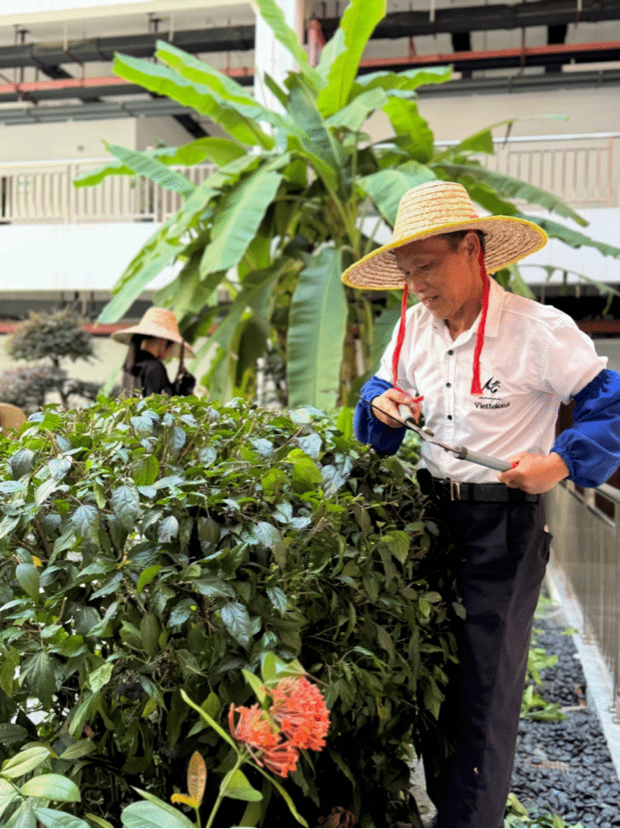 广西建院5月27日讯(后勤管理处 唐尚芳)自1993年到校工作以来,袁江春师傅始终与“校园环境”打着交道,以匠心守护着校园里的一草一木,用岁月勾勒出四季芳华。从秀灵路校区到相思湖校区,浇灌、施肥、修剪、除病虫害,每一项工作都做得细致入微,将对校园的热爱化作点滴行动。