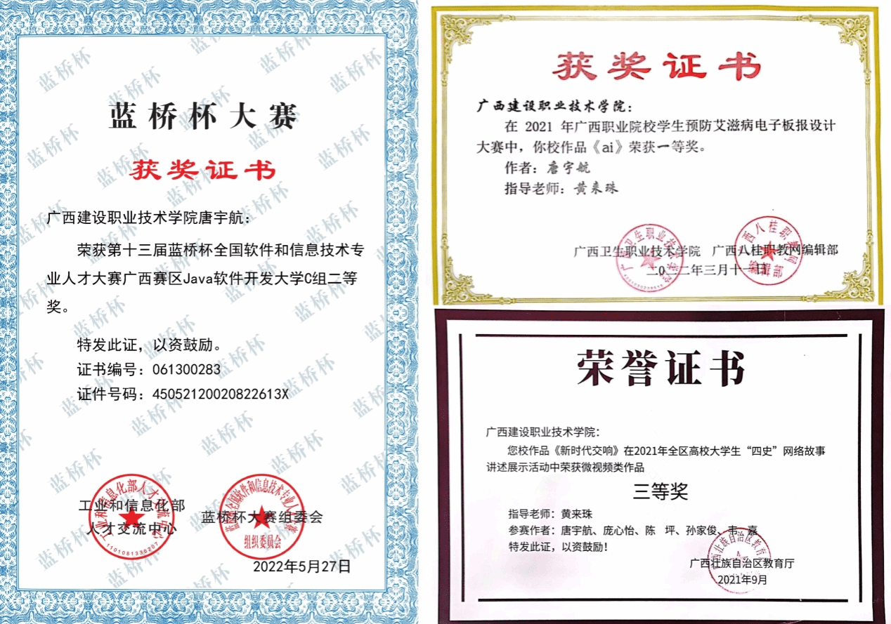 这份认真与专注让唐宇航连续两年斩获校级一等奖学金,两次获评学校“三好学生”“优秀学生干部”,荣获第十三届蓝桥杯广西赛区JavaC组二等奖(工信部人才评价证书)、广西职业院校预防艾滋病电子板报设计大赛一等奖、全区高校大学生“四史”网络故事讲述展示活动三等奖等荣誉,也让他在专升本综合测评中脱颖而出,凭借专业成绩排名前列的优势,顺利获得升学资格,到南宁师范大学读本科。