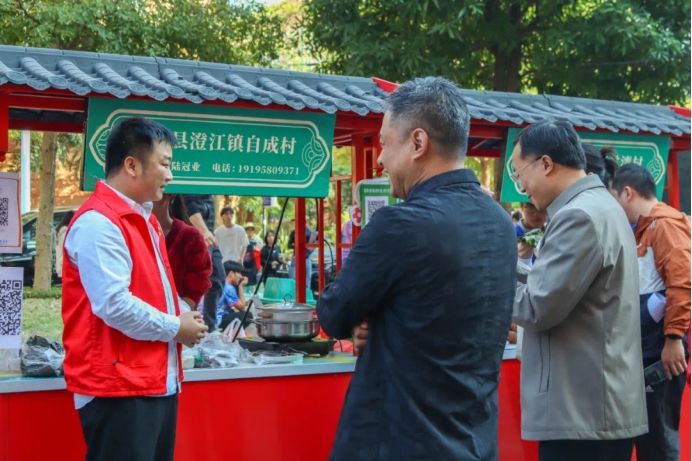 陆冠业(左一)在学校大学生创意创业集市上向师生讲解自成农副产品。 饶昌 摄