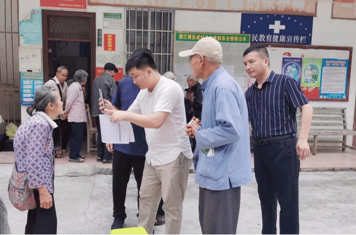 陆冠业(左二)帮助村民进行养老认证。 黄勒 摄