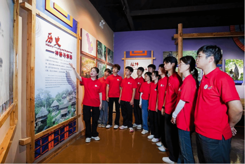 实践团首站走进非遗博物馆,探寻蓝靛染艺背后的文化基因。在非遗博物馆,队员们发现扎染纹样与青花瓷纹异曲同工,猴鼓舞节奏与壮族铜鼓文化共鸣。从靛蓝染料的“一锅靛蓝煮春秋”到纹样中“太阳纹映照着各族对光明的共同向往”,师生们梳理出扎染技艺与瑶族迁徙史、多民族文化交融的深层关联。“这些技艺印证了各民族交往交流交融的历史。原来扎染不只是瑶族的‘独美’,更是各民族共赏自然、敬畏生命的共同表达!”队员们情不自禁感慨道。