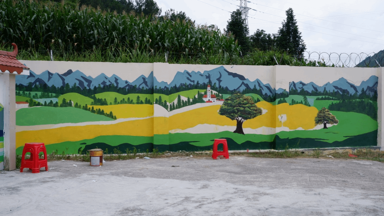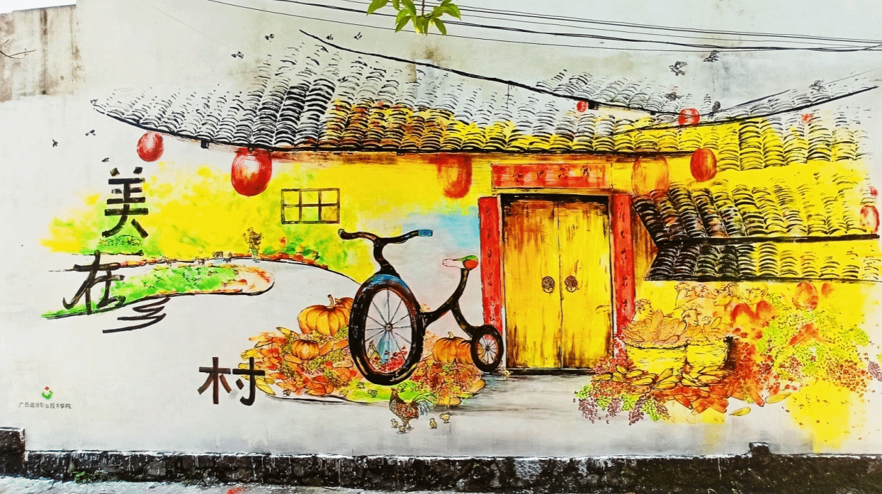 “绘美乡村”实践团为河池市南丹县六寨社区党群服务中心绘制的《强党建引领,建美丽乡村》主题墙画(二)
