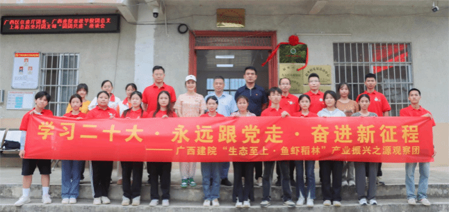广西建院7月18日讯(市政与交通学院 杨铄 黄晶晶 覃小怡)近日,广西住房城乡建设厅团委(简称“厅团委”)、广西建院市政学院团总支、上林县赵坐村团支部“团团共建”座谈会暨广西建院“暑期‘三下乡’社会实践基地”揭牌仪式在上林县赵坐村举行,厅团委书记姚磊,广西建院市政学院党总支副书记(主持工作)刘海彬,广西建院市政学院团总支副书记、观察团带队老师杨铄,赵坐村驻村第一书记申建立等参加座谈会并为实践基地揭牌。广西建院“生态至上·鱼虾稻林”产业振兴之源观察团成员参加活动。
