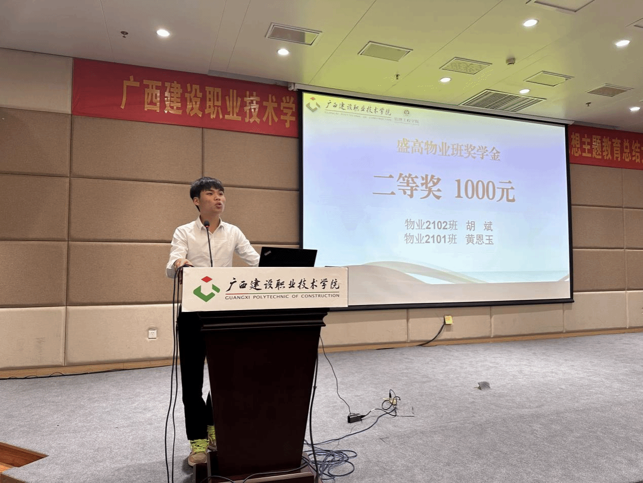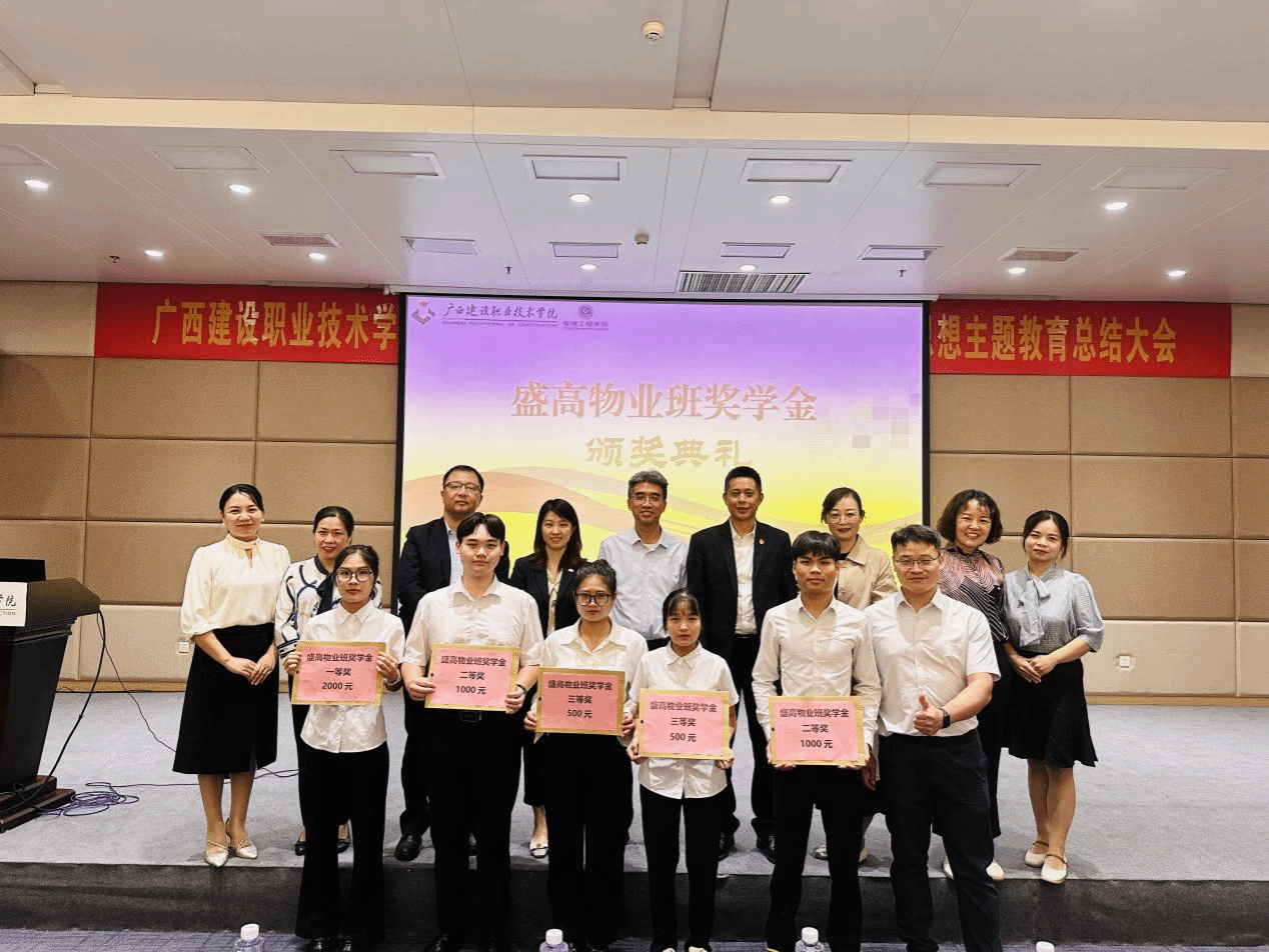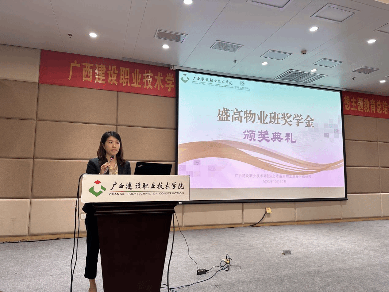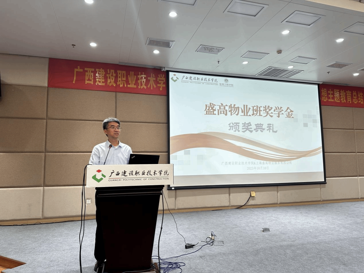 广西建院10月11日讯(管理工程学院 张钰棠)10月10日晚,盛高物业班奖学金颁奖仪式在学校四教一楼报告厅顺利举行。上海盛高物业服务有限公司人力中心总监季雪、人力中心高级经理林晨,上海盛高物业服务有限公司南宁中心城市总经理徐敏智、综合部经理王芳,管理工程学院代端明副院长(主持行政工作)、罗辉副院长、现代物业管理专业教学团队负责人黄娟老师,以及专业教师代表出席了颁奖典礼,现代物业管理专业2022级、2023级全体同学参加典礼。