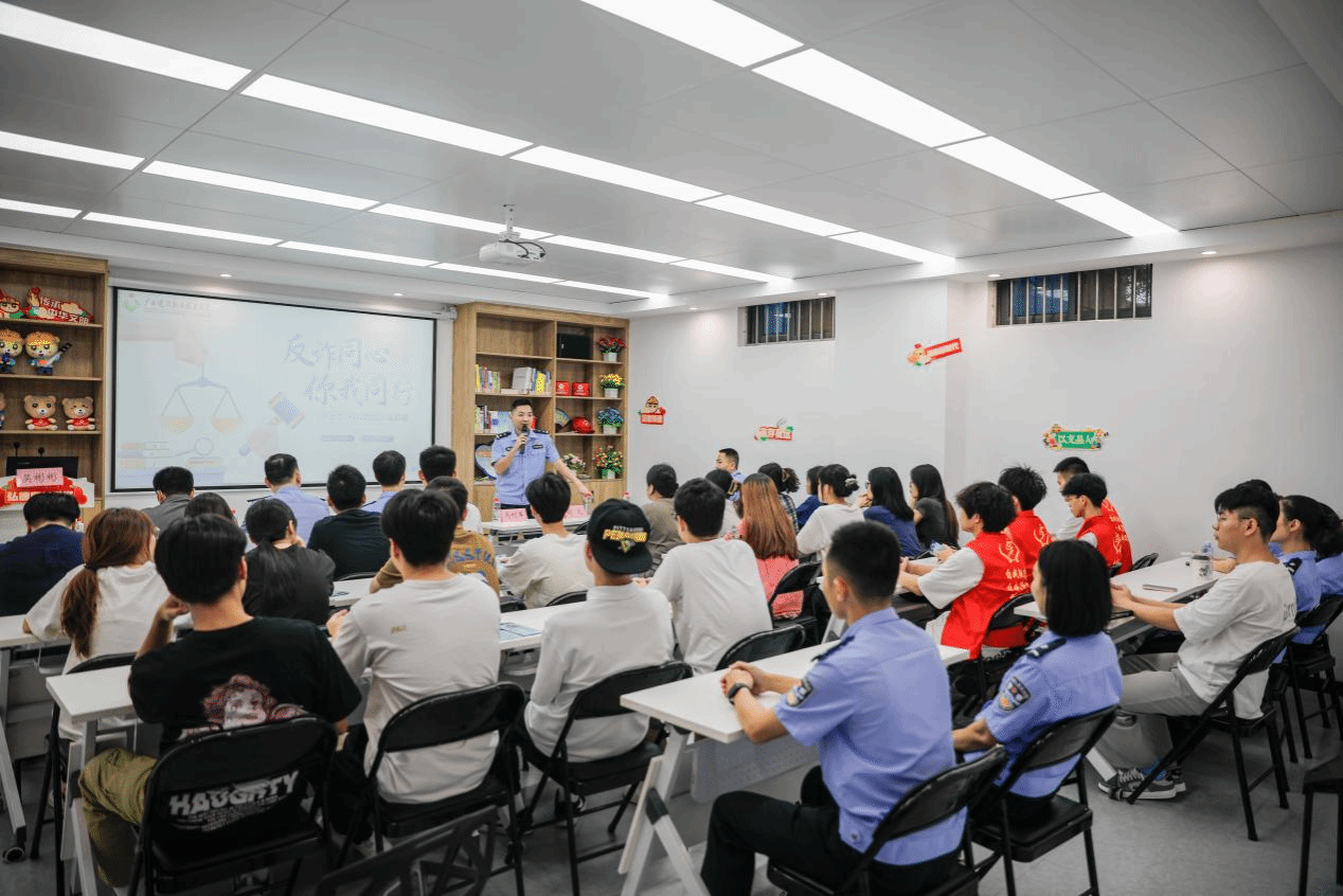 随后,南宁市公安局反诈支队、地铁分局西乡塘站派出所一行前往学生社区安全协作中心开展座谈会。座谈会上,警官们依次为反诈宣传志愿小队的同学讲授了宣传防范电信诈骗的重点和要点,以及“国家反诈中心”APP的使用方法和技巧。
