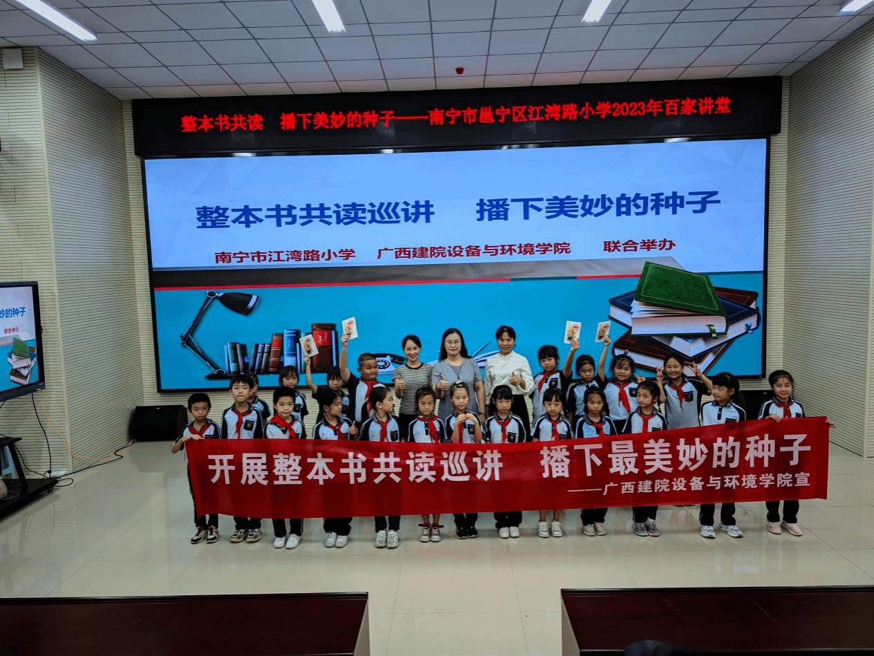 广西建院10月28日讯(设备与环境学院 文/侯文淑 图/韦思源 杨贵维)每一个人的生命都是一粒神奇的种子,童年是最美好的岁月,而阅读能够唤醒这种潜在的美好与神奇。10月27日下午,设备与环境学院党总支书记侯文淑应邀参加南宁市邕宁区江湾路小学开展的百家讲堂活动,为200多名江湾路小学的学生导读中华先锋人物故事汇丛书——《袁隆平“东方稻神”》。