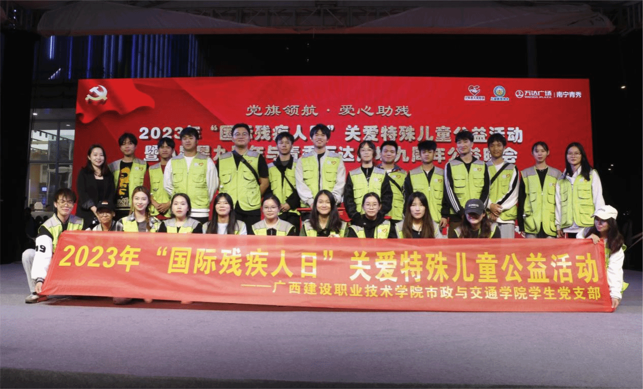 广西建院12月9日讯(市政与交通学院 刘晗蕾)12月3日是第32个“国际残疾人日”,市政与交通学院学生党支部作为协办单位组织26名学生入党积极分子参与“党旗领航 爱心助残”2023年“国际残疾人日”关爱特殊儿童公益活动暨小星星九周年与青秀万达广场九周年公益晚会。本次活动由南宁市儿童康复行业协会党支部、广西残疾人福利基金会等单位主办,南宁市小星星社会工作服务中心等单位承办。