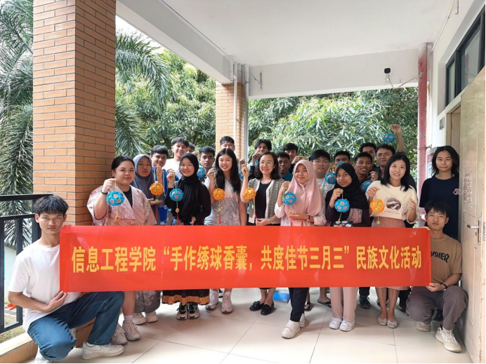 广西建院4月10日讯(文/梁晶晶 图/何鑫)4月9日下午,在“广西三月三”传统节日到来之际,为了让留学生们更好地感受中国传统文化,信息工程学院在向阳花工作室组织开展了“手作香囊绣球,共度三月三”民族文化体验活动。学院党总支书记、团总支书记、学院辅导员、17名留学生及学生代表参加了本次活动。
