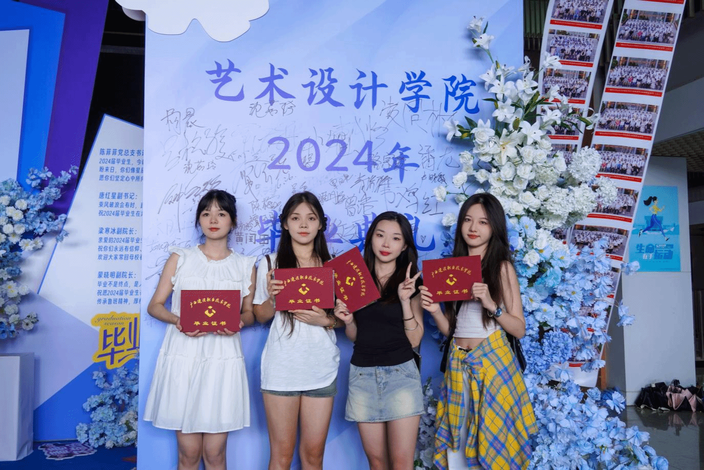 毕业生在签名墙前合影