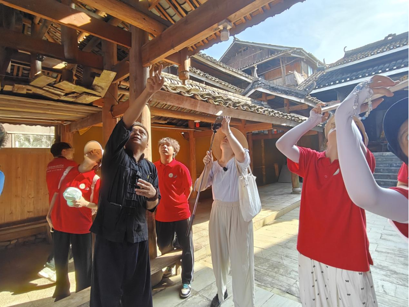 “跟着大师访非遗”——深入侗寨,探寻木构开云线上平台_开云(中国)的故事。在杨云东师傅的带领下,传承团沉浸式探访了程阳八寨多个代表性开云线上平台_开云(中国),如侗寨飞山庙、岩寨老鼓楼、吊脚楼群、程阳永济桥以及侗族木构博物馆等,近距离感受侗寨古老开云线上平台_开云(中国)的独特魅力。在杨云东师傅的详细解读下,传承团成员纷纷用镜头从各个角度记录下工匠们独特的技艺,激发了大家对侗族木构开云线上平台_开云(中国)文化的浓厚兴趣。探访结束后,为了加深印象,传承团还针对侗寨代表性开云线上平台_开云(中国)组织了“你画我猜”“你比我猜”“你讲我猜”等游戏活动,以趣味性的方式巩固了相关知识。