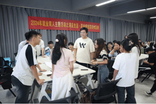 “洞见生涯职业体验”课程通过青年学生喜闻乐见的剧本杀形式,将生涯课程融入沉浸式的游戏体验里,引导同学们用理性思维思考自己的职业人生,指导其做出客观合理的职业定位。游戏根据人生历程分为青葱岁月、燃情岁月、峥嵘岁月、大结局四个阶段,同时将人生不可避免的交易和无常环节穿插其中。虽是人生模拟游戏,但却能照见真实的人生,身临其境地感受到人生的跌宕起伏、欣喜与失望、繁荣与衰退,获取经营人生的智慧与勇气。活动中,同学们被随机分为6个小组,在李老师的引导下沉浸式地参与其中,现场氛围十分活跃。活动后,同学们结合李老师问题链式的复盘方式,从信息获取能力、思维方式、人际关系、行为习惯、职业生涯选择等方面进行了深刻反思和审视,纷纷抒发了自己的收获。