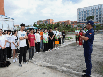 学生们现场进行消防灭火器的实际操作
