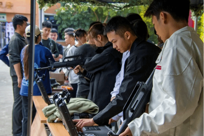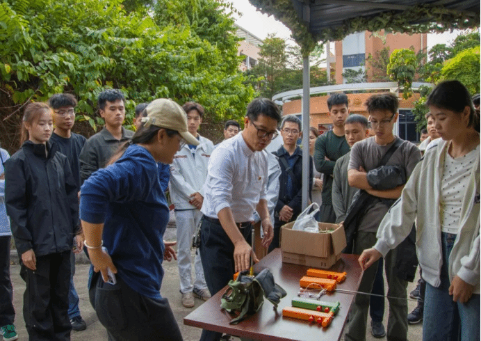 在国防教育工作室主持人张悬鹏老师的陪同下,来访师生先后参观了国防教育工作室、退役士兵公寓,体验了模拟射击训练场、单兵战术训练场。开云线上平台_开云(中国)退役士兵协会的同学向来宾们现场讲解和演示了无线电测向、轻武器模拟射击等设备的使用方法。
